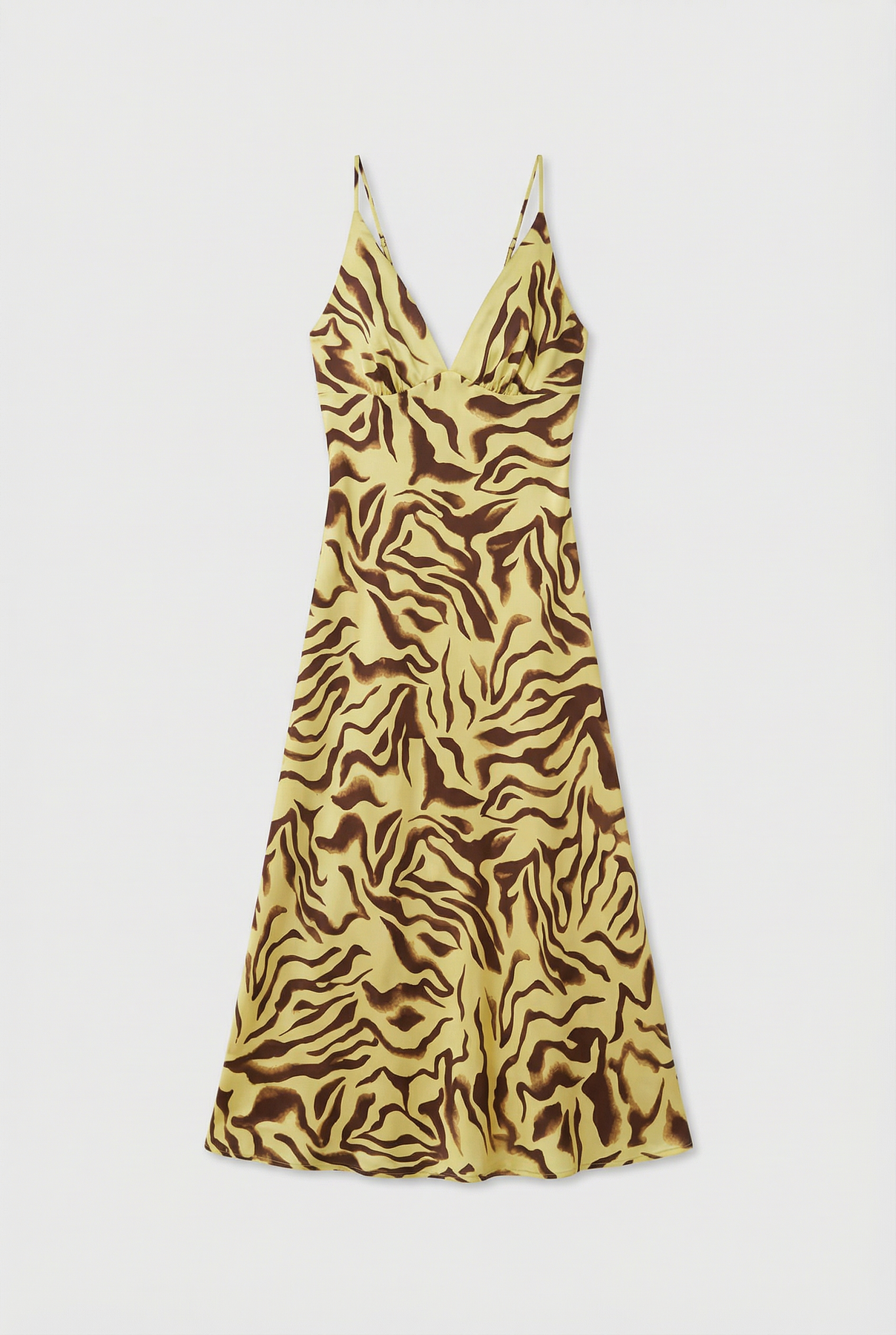 Wild instinct, refined silhouette. A fluid midi cut in a striking golden tiger print — bold enough to turn heads, elegant enough to mean it. For the woman who knows that standing out and standing tall are the same thing.